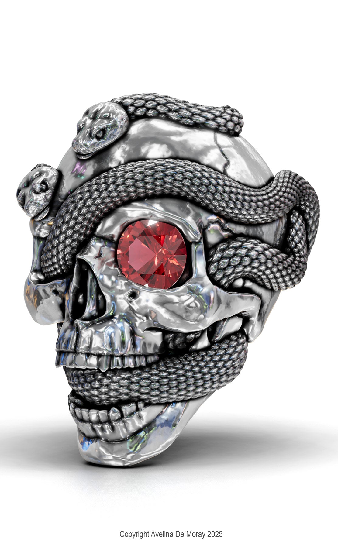 Crafted with intricate detailing, this miniature skull is crowned by a coiled serpent that wraps protectively over the design. A single deep ruby-red gemstone eye glows from the skull, adding a flash of colour and danger.
