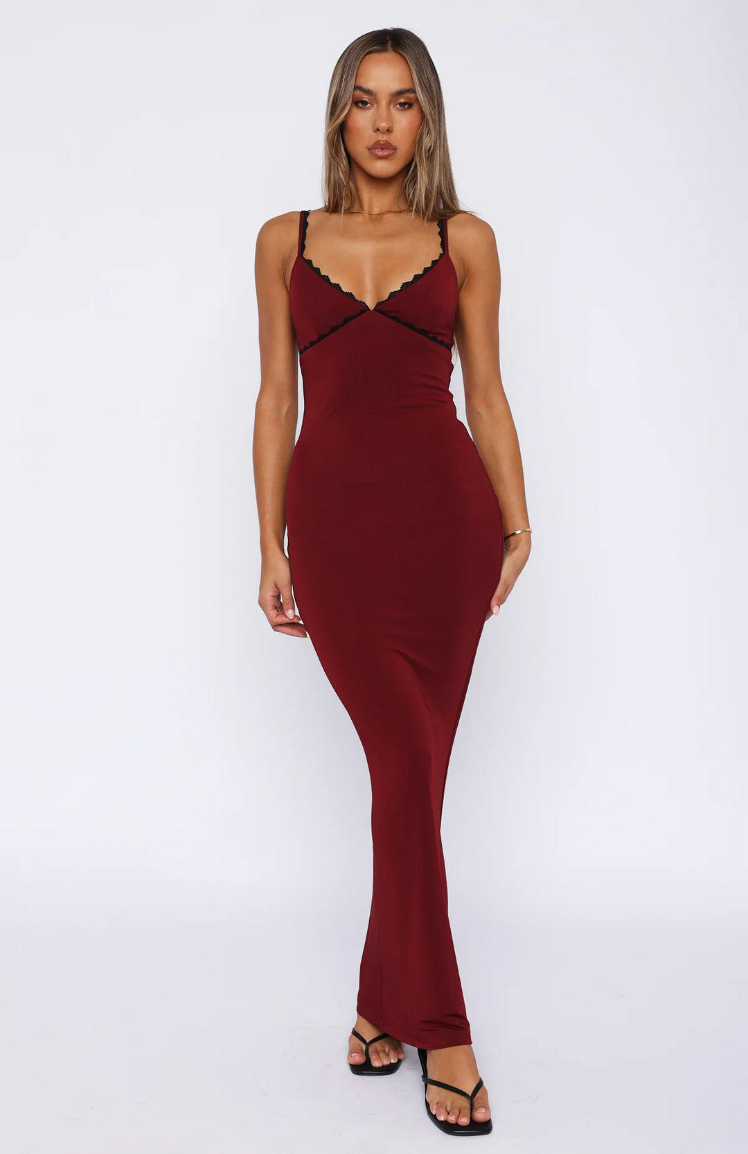 Get your hands on the gorgeous Only The Young Maxi Dress Wine. Features a low cut neckline, black lace trim detailing, thin adjustable straps, slip on style design, lined fabric and super soft, stretch fabric. This dress is a must have this season.